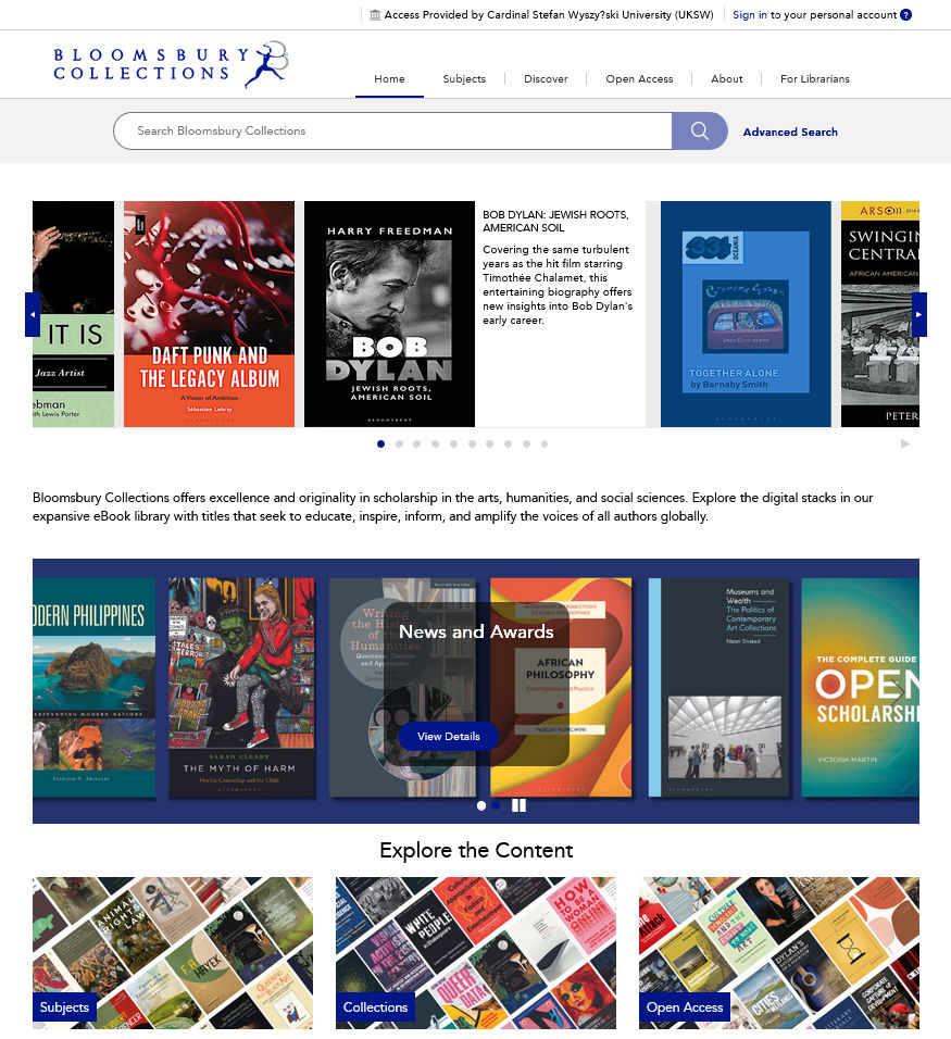 Aby skorzystać z zawartości bazy Bloomsbury Collections z terenu kampusów UKSW wejdź na stronę: https://www.bloomsburycollections.com/